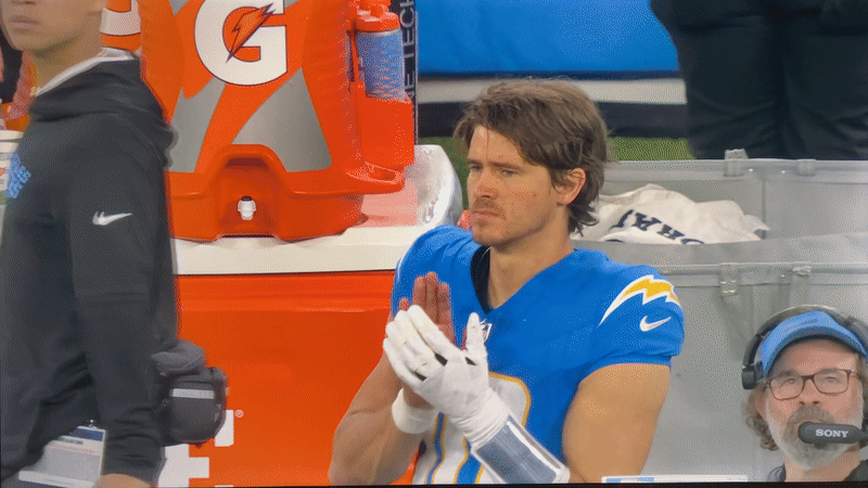 Justin Herbert is also an Alien. I hypothesize that this is why these two men get along. Case in point, Justin Herbert staring into nothingness while golf-clapping after a holding call. Doesn’t look normal to me, reader!