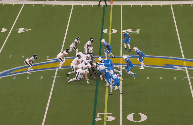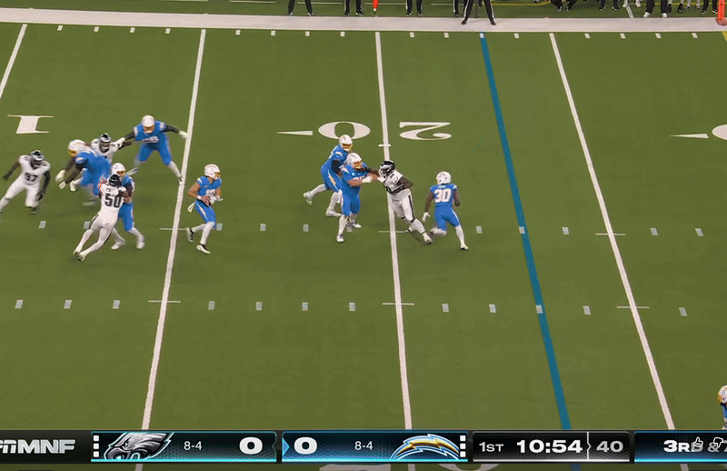 After a shaky opening drive, the Eagles’ defense tightened up. They pressured Justin Herbert all day, plowing through an injured offensive line. Herbert had a lot of success scrambling away from pressure at times, but for most of the day he took hit after hit and couldn’t get in a position to get the ball to his receivers.