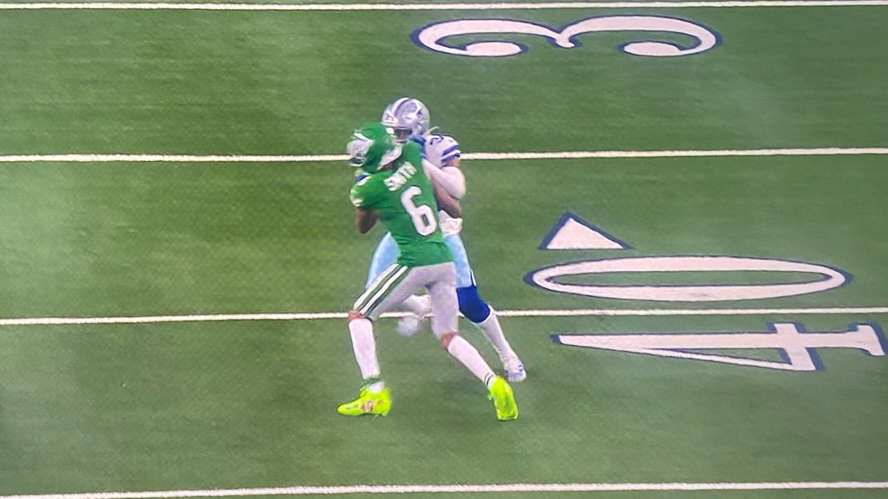 On Dallas’ next drive, George Pickens made an insane 43-yard catch over Cooper DeJean and Sydney Brown before Prescott scrambled to his right and flipped over Sydney Brown for an 8-yard touchdown to tie the game at 21-21.