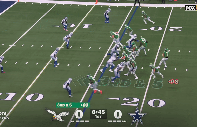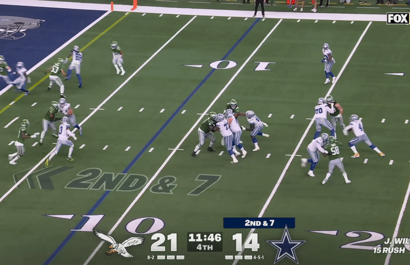 Kevin Patullo Should Take a Page from Klayton Adams Playbook: One thing you notice about the Cowboys offense (run by “man who has the name of a used car salesman” Klayton Adams) is how much they shift the pocket for Dak Prescott. They used misdirection, play-action roll-outs, bootlegs, and other techniques to neutralize Philadelphia’s pass rush and keep the defense off-kilter. The Eagles’ offense is static. We know they rarely use motion, and they keep the pocket in one spot for Hurts. There are advantages and disadvantages. Advantages are neutralizing an opponent’s pass rush and maximizing the threat of Hurts’ legs outside of the pocket. Not to mention an element of deception that the run game can utilize to create mismatches. The disadvantages are the offensive line doesn’t always know where the quarterback is and where to block. But it’s worth experimenting with ways they can move Hurts around to give him some easy answers.