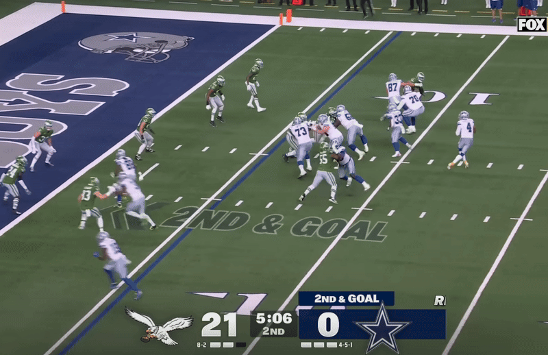 Dallas’ next offensive possession stalled out, but their special teams made a huge play on the punt return by forcing a fumble on Eagles kick returner Xavier Gipson. With the ball in the redzone, Philadelphia’s defense made a huge 4th and goal stand to get their offense the ball back.