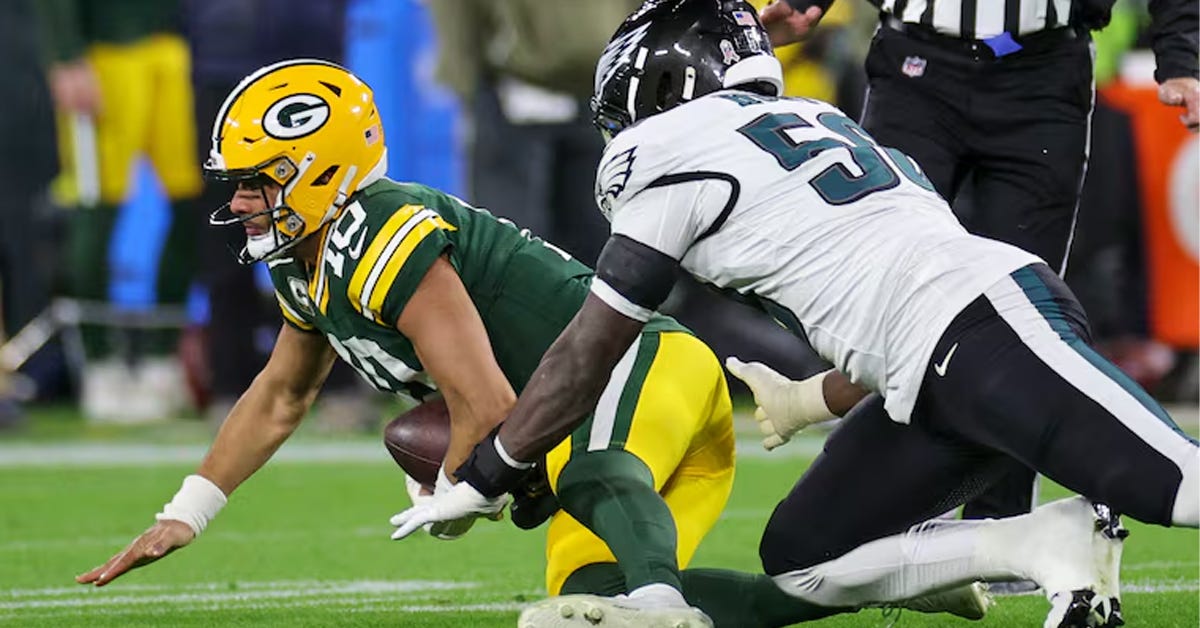 After forcing the Eagles to punt, Green Bay had the ball and a chance to tie with 2:18 left in the game. Unfortunately, the pass rush was all over Love. Nolan Smith forced a bad ball on a 2nd and 10 before Love hit Luke Musgrave to make it a 4th and 1. With the game on the line, the Packers handed the ball to Josh Jacobs, who fumbled on a Jaelan Phillips tackle.
