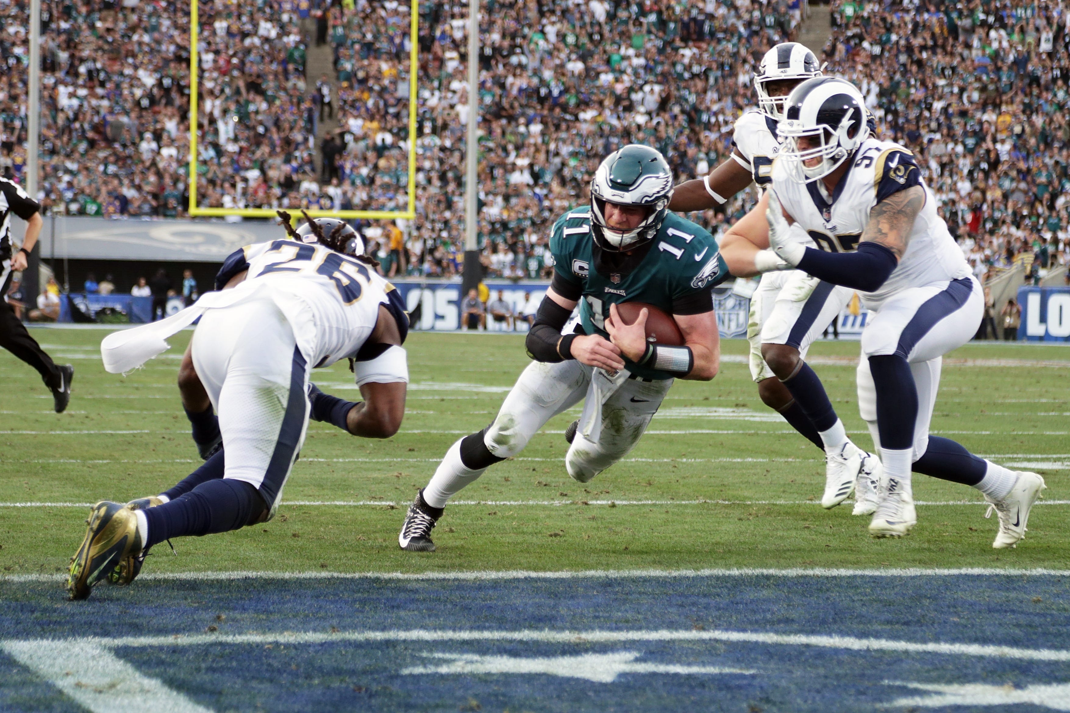 Wentz takes the Eagles offense right down the field with a series of miraculous throws. In the redzone with 3:53 left in the third quarter, Wentz scrambles to his right and dives in for a touchdown. As he’s diving, two Rams defenders hit his knee from either side. Though Wentz makes it into the endzone, a holding penalty against Philadelphia negates the touchdown.