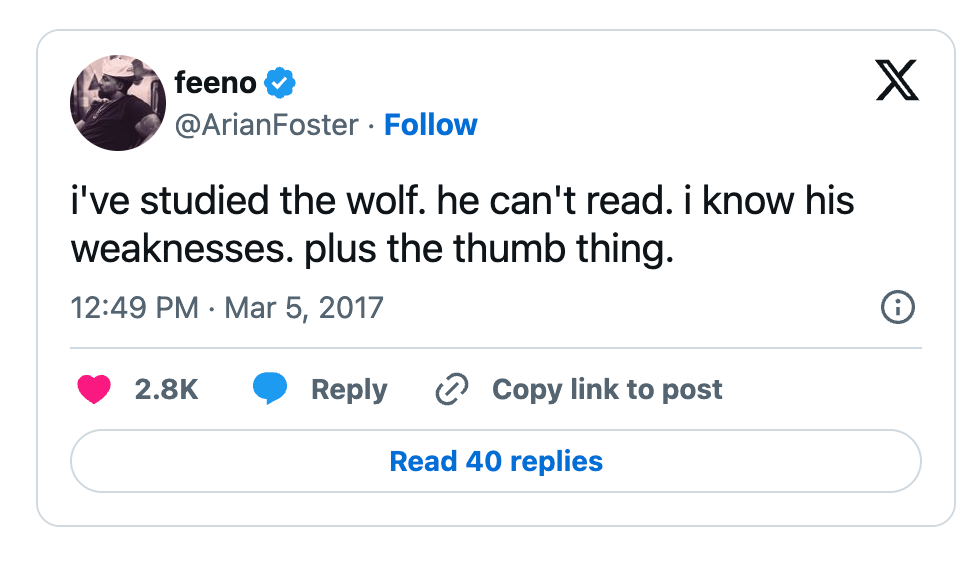 This is honestly just to hear Arian Foster say and tweet weird things. Like that time he talked about how he could be a wolf in a fight 1-on-1. The Texans could also use him in the backfield, but make no mistake, I just want the entertainment of Arian Foster saying weird stuff.