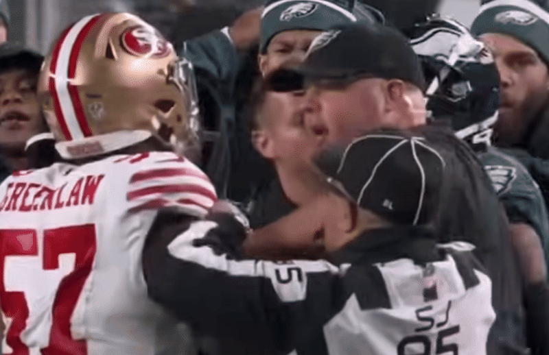 To make things weirder, San Francisco linebacker Dre Greenlaw threw a jab at Eagles Chief of Security/man who does everything without saying a word, Big Dom. Both Dom and Greenlaw were ejected for the scuffle. The Eagles crowd cheered as Dom left the field, the only thing they were cheering for all night.