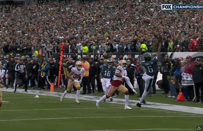 Two moments from the 2023 NFC Championship game served as the big bang of this beef. The first happened with 10:28 to go in the first quarter. On 4th and 3, Jalen Hurts took the snap and rolled to his left to evade pressure. Eyes fixed down the field, he floated a pass to DeVonta Smith, who reached his outstretched arm to the sky and made a one-handed catch over his defender to reel in the ball on his way to the ground. The replay contested that Smith may not have completed the act of the catch on his way to the ground, but referee Alan Eck (more on him later) and his crew maintained that it was a catch. The Eagles would go on to score the first touchdown of the day on a Miles Sanders touchdown run.