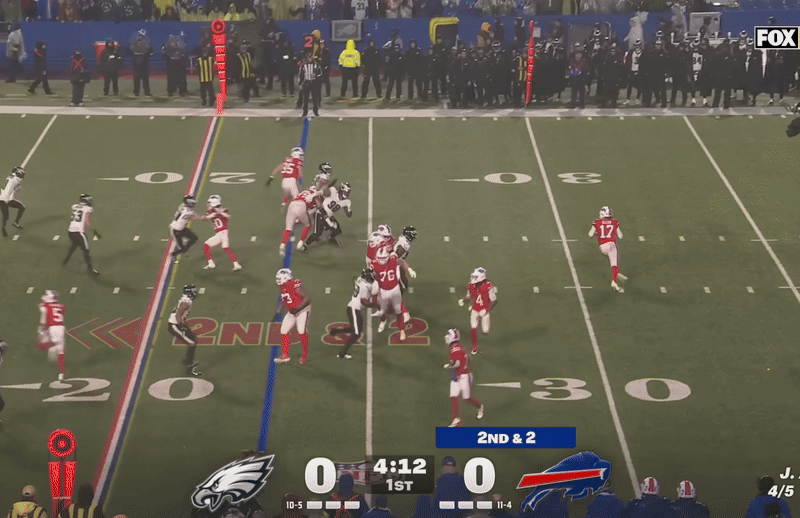 On the Bills’ next possession, Cooper DeJean recovered a James Cook fumble, but upon review, the refs ruled that Cook was down by contact. On the next play, Jalen Carter rushed up the middle to destroy Josh Allen for a 9-yard sack. Reed Blankenship ended the drive with a huge hit on Bills receiver Khalil Shakir on 3rd and 18.