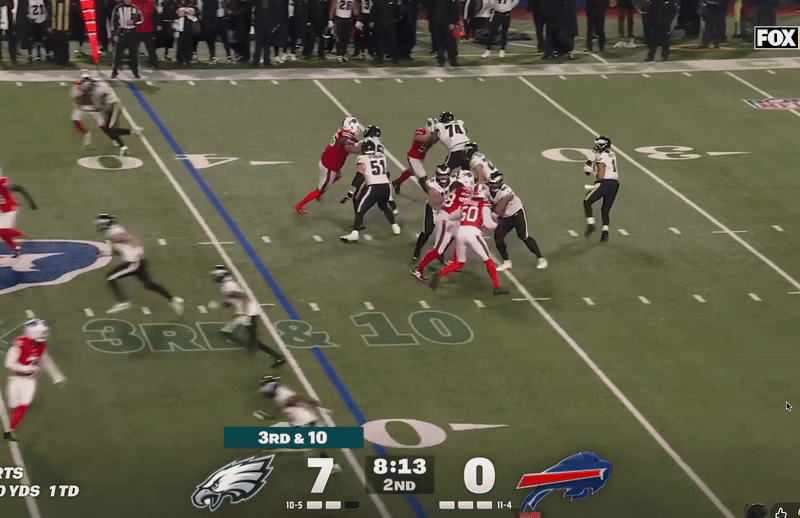 After forcing Buffalo to punt on their next possession, a Bills player stumbled into the knee of punt returner Britain Covey, resulting in a 15-yard penalty. On 3rd and 4 from Philly’s 29-yard line, Jalen threw a beautiful tight-window throw to DeVonta Smith between two defenders for a first down. Later in the drive, on 3rd and 10 from Philly’s 40-yard line, Hurts narrowly escaped pressure in the pocket and rolled out to his right and threw a dime down the sideline to A.J. Brown for 19 yards.